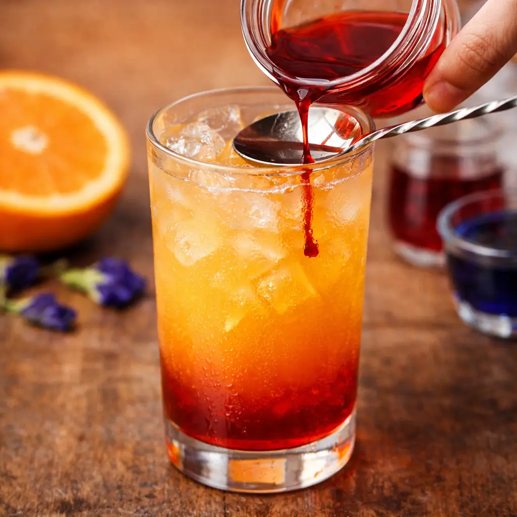 The key technique is layering: grenadine sinks to the bottom (creating that deep red sunrise glow) while sparkling orange juice floats above it. Add blue lemonade or butterfly pea tea on top and you get the full desert sky — red, orange, and violet all in one glass.