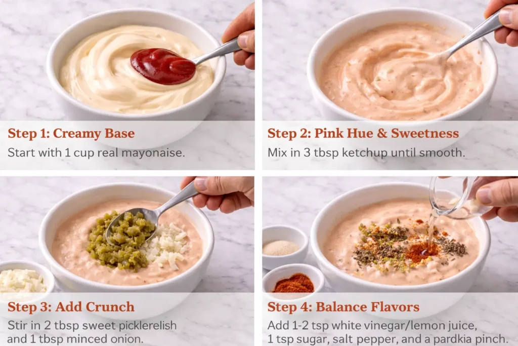 Stir in 3 tbsp ketchup until smooth. Watch it turn that iconic light pink—core to any original thousand island dressing recipe. Pairs well with our coconut sugar caramel sauce recipe for sweet twists.