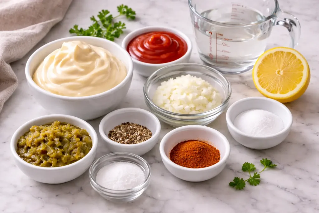 Core thousand island dressing ingredients include mayo, ketchup, relish, vinegar, onion, and seasonings.