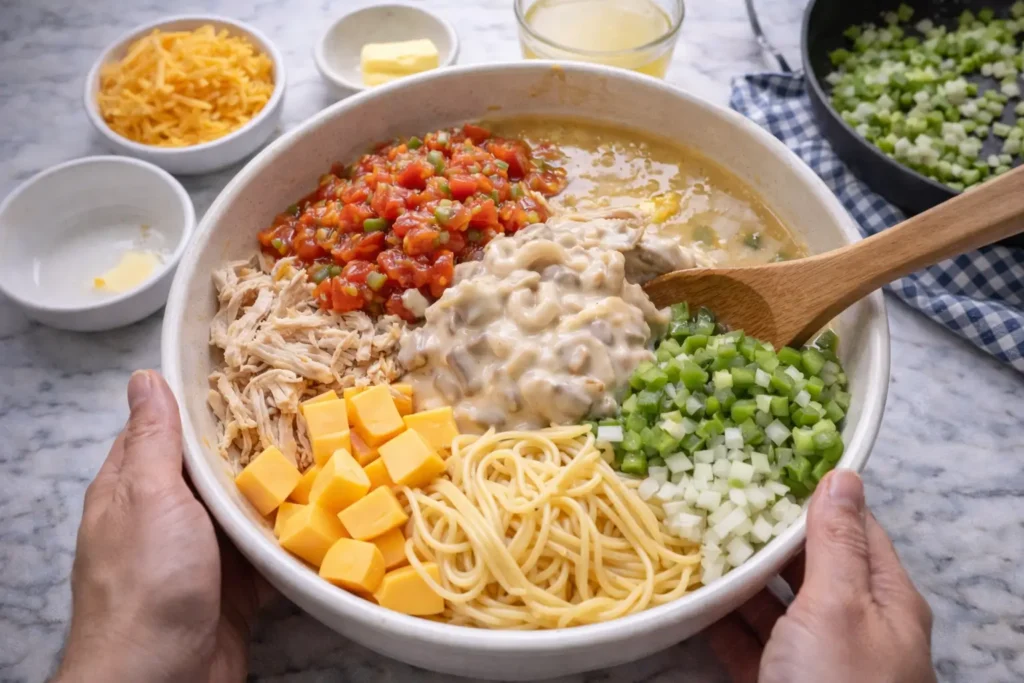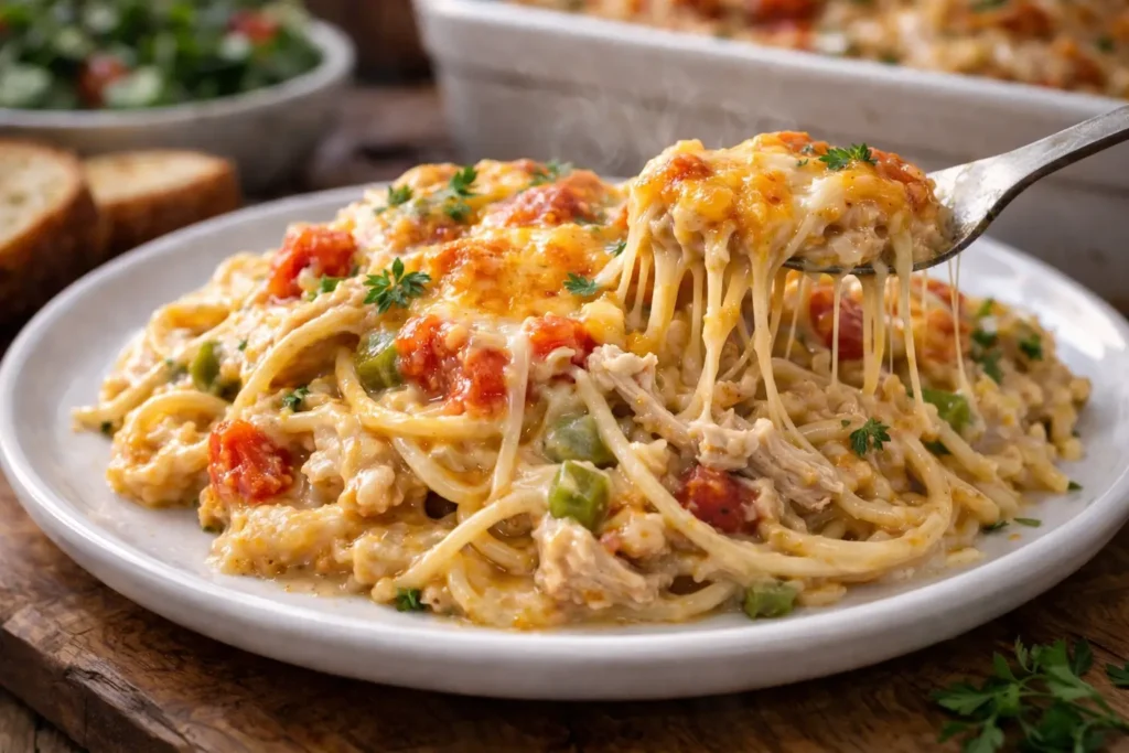 At its core, this is a baked pasta casserole — but a very specific one. Joanna’s version features tender shredded chicken, thin spaghetti noodles, and a rich sauce built from Velveeta cheese, cream of mushroom soup, and Rotel diced tomatoes with green chilies. The whole thing gets poured into a baking dish, topped with shredded cheddar, and baked until golden and bubbling.